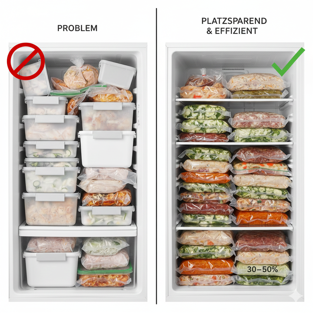 Das bedeutet: Es wird oft unnötig viel „leere Luft“ mit eingefroren. Das kostet nicht nur Energie, sondern nimmt auch wertvollen Platz im Gefrierschrank ein.