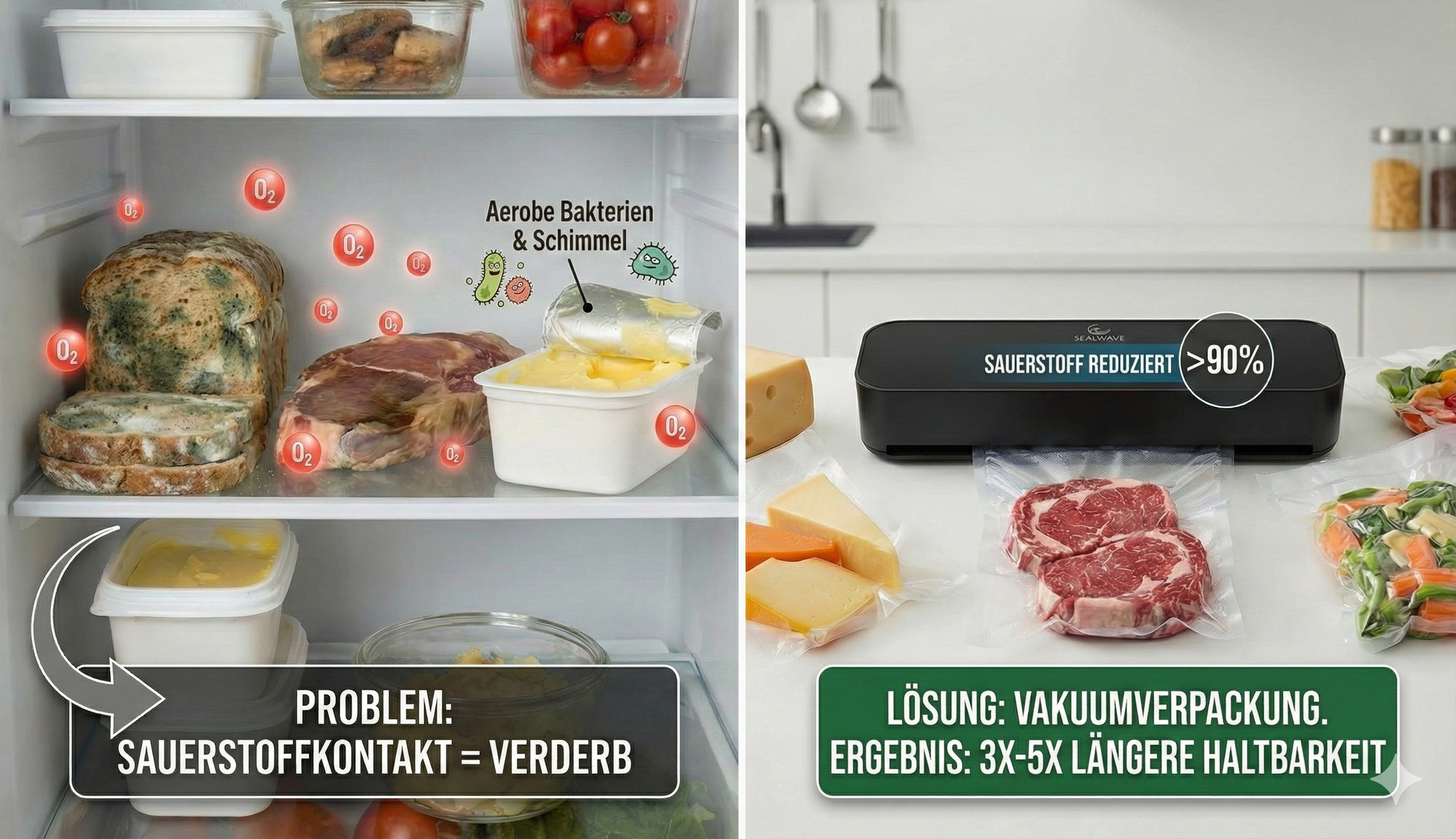 Fette werden ranzig, Vitamine zerfallen, und wertvolle Aromen gehen verloren. Das beeinträchtigt nicht nur Geschmack und Nährwert, sondern macht Lebensmittel schneller ungenießbar.